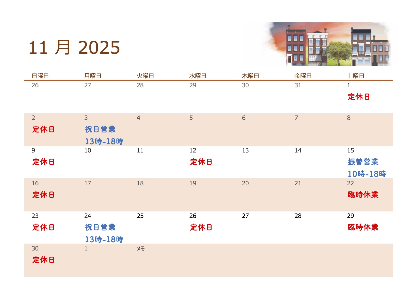【11/7更新】10・11月の定休日について 2025年10月・11月分の定休日情報を更新いたしました。ご来店の際はお気をつけてお越しください(予約不要)※11月は下記変則的な営業日となります 11/15…通常営業11/22、29…臨時休業 恐れ入りますがよろしくお願いいたします 定休日カレンダー<2025年10月>定休日カレンダー<2025年11月>